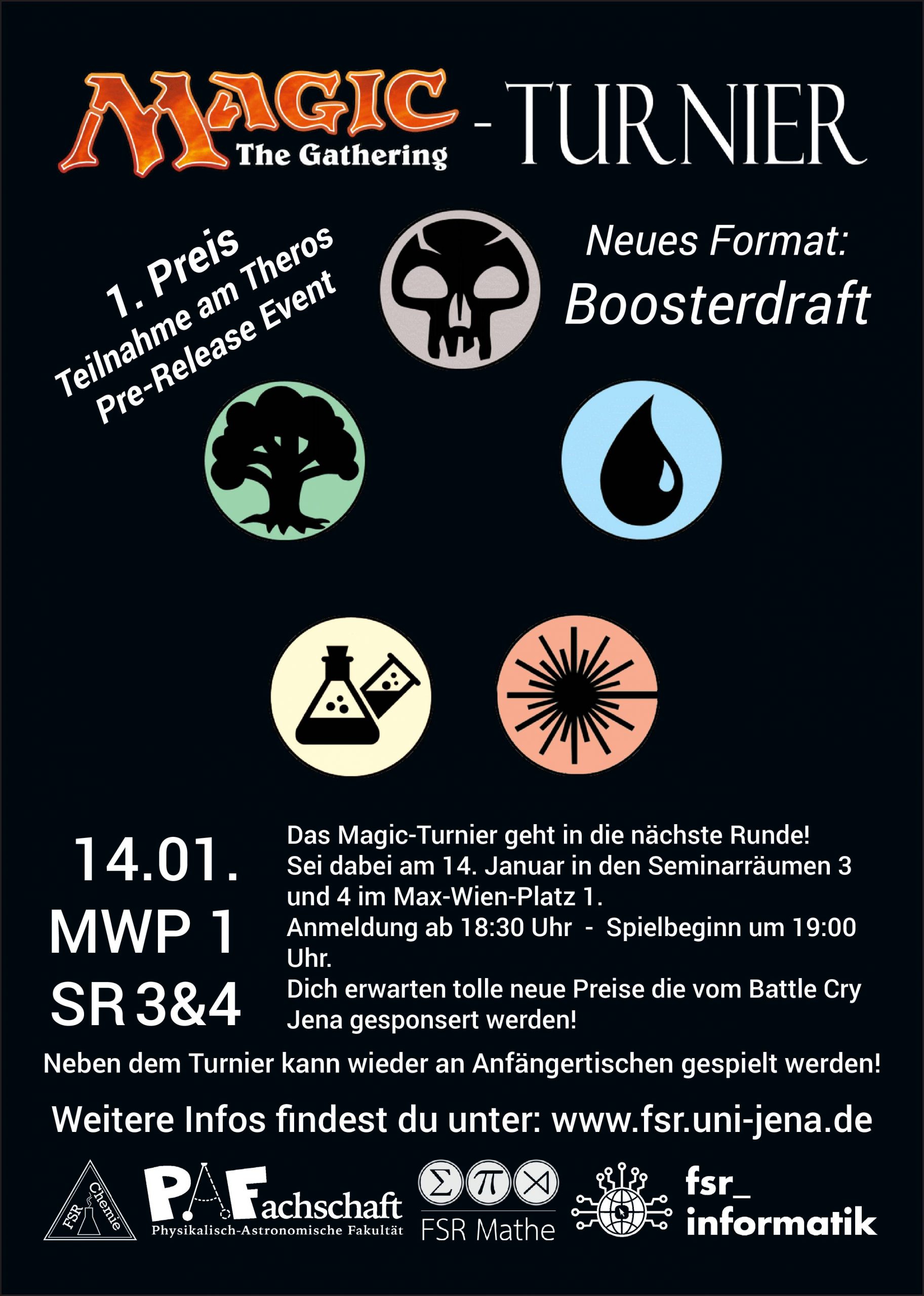 AN DIE ALTEN HASEN: Die FSRe Physik, Mathematik Informatik und Chemie laden euch wieder zum traditionellen Magic-Turnier ein. Wir spielen am 14.01.2020 in den Seminarräumen 3 und 4 im Max-Wien-Platz 1. Die Anmeldung beginnt um 18:30 Uhr und ab 19:00 Uhr beginnen die Spiele. Das Format ist diesmal ein Boosterdraft (weitere Informationen zum Modus findet ihr weiter unten). Preise für die Besten der Besten sind organisiert. Diesmal werden euch Preise gesponstert vom Battle-Cry Jena, u.a. eine Teilnahme am PreRelease zu „Theros: Jenseits des Todes“, winken 😉